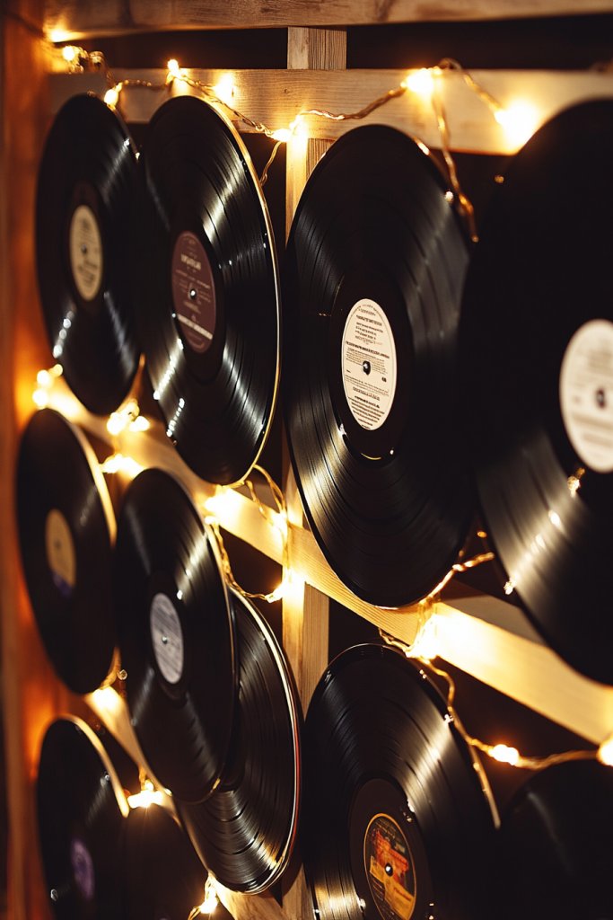 Picture records hung vertically or horizontally on a wooden or metal frame, softly illuminated by warm string lights. The gentle glow highlights the textured labels and glossy surfaces, creating a layered visual effect. The string lights weave through the records, casting flickering shadows that dance across the wall. It’s like having your own mini concert hall right in your living room, perfect for relaxing evenings.