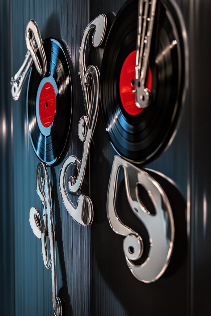 Want to give your walls a textured, layered look that’s full of character? Looking for a way to combine different materials for a more dynamic decor piece? A record paired with metal cutouts of musical symbols or instruments creates a striking visual contrast. It’s a modern take on musical memorabilia that adds depth and sophistication.