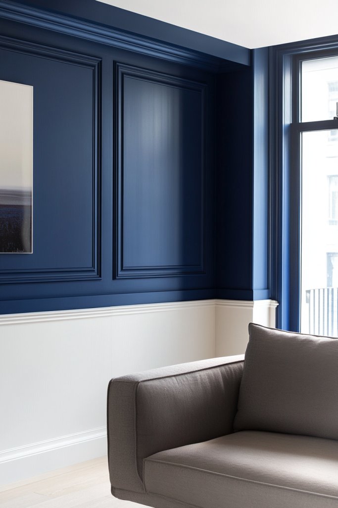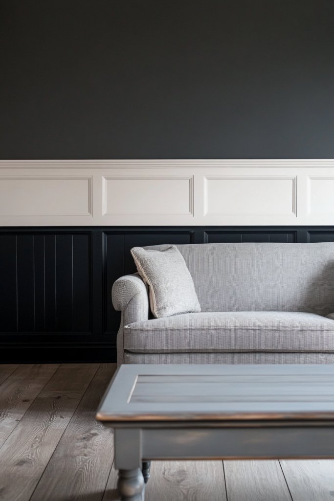 Imagine the lower half of your walls painted in a dark, rich hue like navy or charcoal, while the upper wall remains a crisp white or soft pastel. The stark contrast draws the eye downward and upward, emphasizing the room’s proportions. Visualize a cozy living room with a dark wainscot paired with light walls, accentuated by plush textiles and subtle lighting—all working together to create a layered, inviting space.