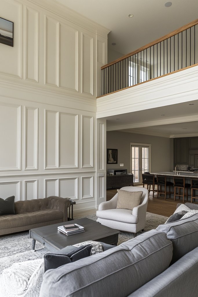 Feeling like your large open space needs more visual interest? Wainscoting with two-tier paneling introduces layered depth that adds sophistication and dimension. It’s a smart way to break up expansive walls and create a cozy, curated feel. If your room feels a bit flat or overly plain, this layered approach is the perfect fix.
