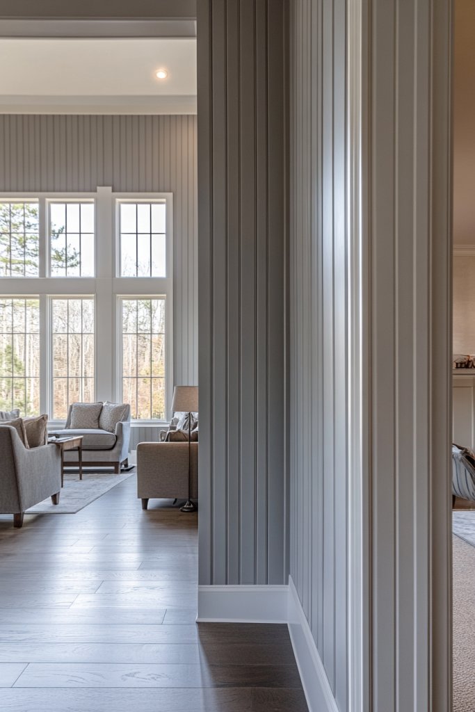 Imagine tall, slender panels running from floor to ceiling, painted in neutral tones or bold hues. The vertical lines draw your eye upward, enhancing the perception of height. Visualize a room with a high, airy feel, complemented by minimal furniture and soft lighting, emphasizing the openness. The textured grooves add subtle depth without overwhelming the space.