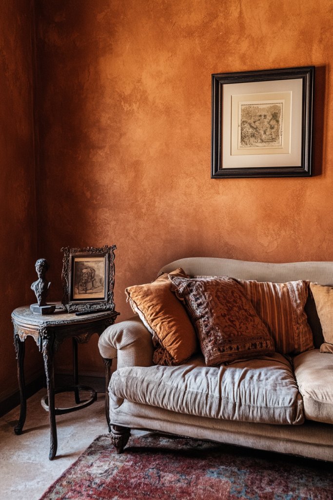 Imagine cinnamon-colored walls complemented by antique furniture and textured rugs. Incorporate plush cushions, vintage lamps, and layered textiles to add depth. The warm hue pairs beautifully with distressed wood and brass accents. Think of a cozy corner with a vintage armchair, a soft throw, and a side table filled with nostalgic decor.