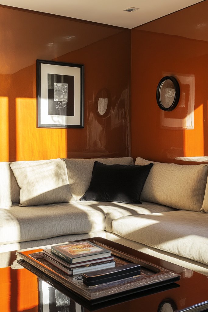 Sunlit rust energizes large, open spaces with vibrance and warmth. It encourages social interaction and makes your home feel lively. Trust the boldness—layer textures and lighting to keep the space dynamic yet cozy. Your open-plan can become a vibrant hub that reflects your personality.