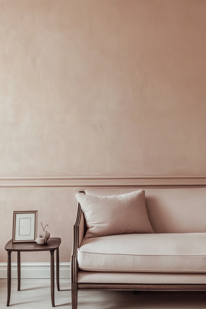 Visualize blush sepia walls paired with simple, elegant furniture and textured textiles like wool or linen. Incorporate soft lighting—warm LEDs or indirect fixtures—that enhances the gentle hue. Use subtle decorative accents like textured cushions or minimalist art in earthy tones to add depth. The overall look is refined, inviting, and understated.