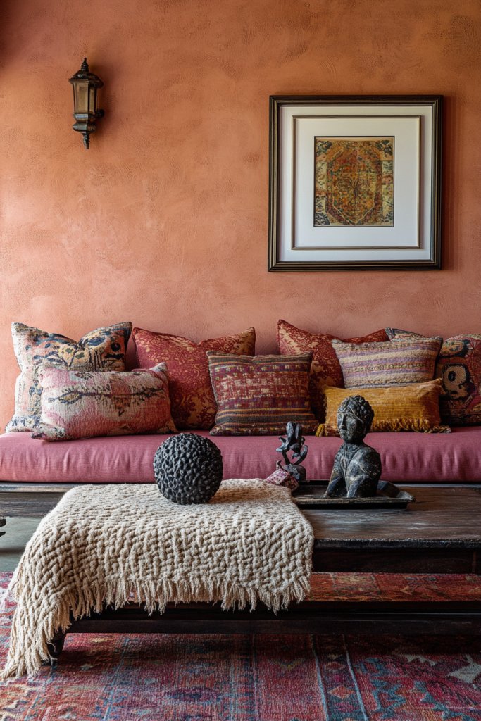 Picture cinnamon rose walls accented with layered textiles—knitted throws, embroidered cushions, and patterned rugs. Add decorative elements like vintage mirrors, colorful ceramics, and textured wall hangings. Use warm lighting—like lanterns or string lights—to cast a cozy, inviting glow. The room becomes a tapestry of warmth and personality.