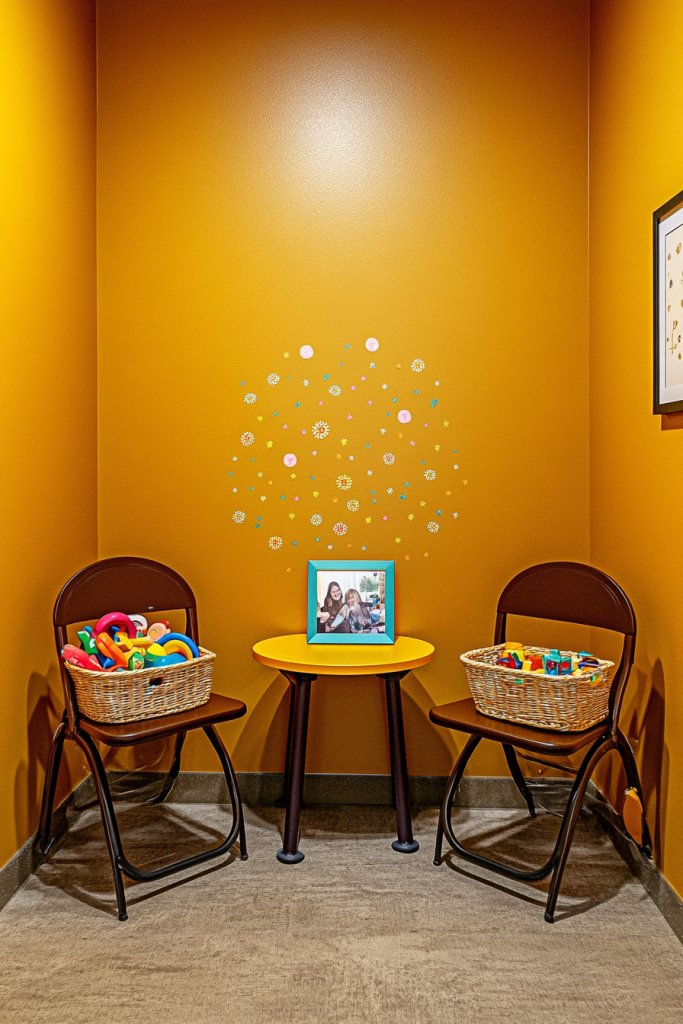 Visualize goldenrod walls paired with colorful, tactile textiles—soft cushions, playful rugs, and textured throws. Incorporate playful decor like wall decals, framed art, or storage in bright, coordinating shades. Use natural light or warm artificial lighting to amplify the cheerful atmosphere. The space feels lively, inviting, and perfect for play.