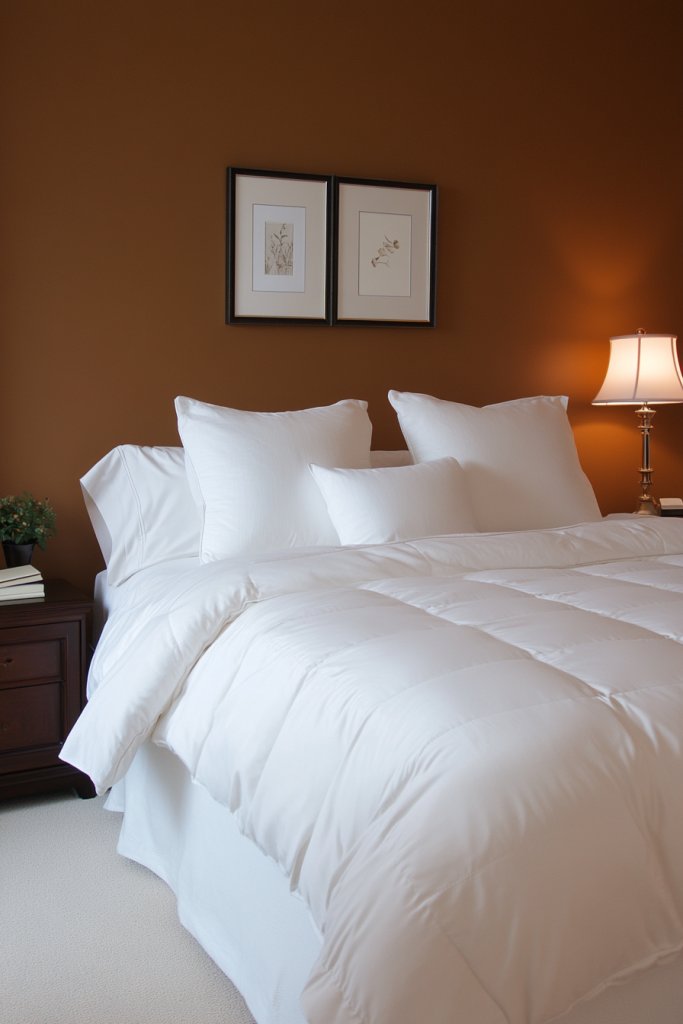 Visualize soft caramel walls paired with plush bedding in neutral tones. Add layered textures with a shaggy rug, linen curtains, and cozy throw blankets. Gentle, warm lighting, like bedside sconces or indirect lamps, enhances the calming atmosphere. The room feels inviting, with a subtle glow that lulls you into relaxation without overwhelming your senses.