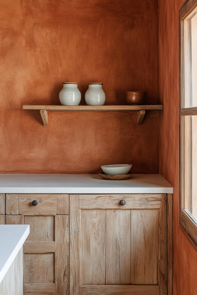 Picture terracotta walls accented by natural wood cabinets and open shelving. The warm hue pairs beautifully with stone countertops and vintage-inspired fixtures. Imagine a bowl of fresh fruit on the counter, with sunlight casting a glow on the textured walls. The overall vibe is rustic yet refined, perfect for family dinners and casual gatherings.