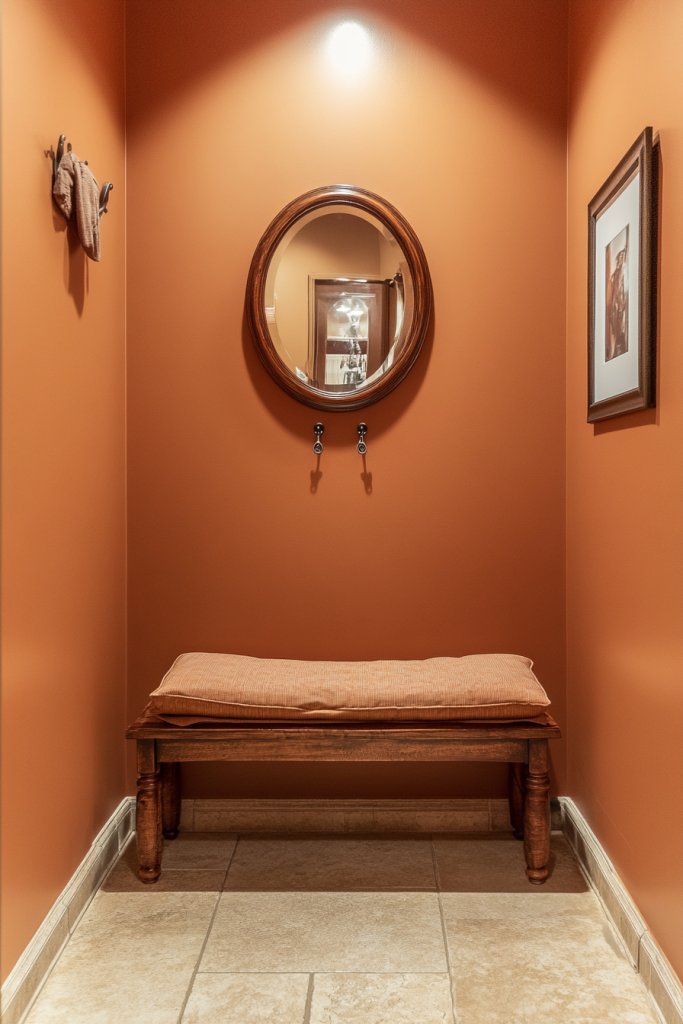 A cinnamon entryway welcomes everyone with warmth and charm. It’s a simple upgrade that transforms the entire mood of your home’s first impression. Trust your color instincts—layer textures and lighting to amplify the cozy effect. A fragrant candle or subtle scent can complete the inviting vibe, making your home irresistible from the moment guests arrive.