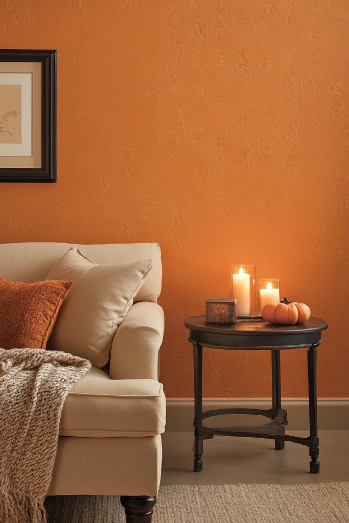 Envision a wall painted in rich spiced pumpkin, contrasted with white or soft beige trims. Layer in textured throws, rustic shelving, or vintage accessories to enhance the fall vibe. Use warm lighting to cast a soft glow, making the space feel like a cozy cabin. Add decorative gourds, dried flowers, or woven baskets to complete the seasonal look.