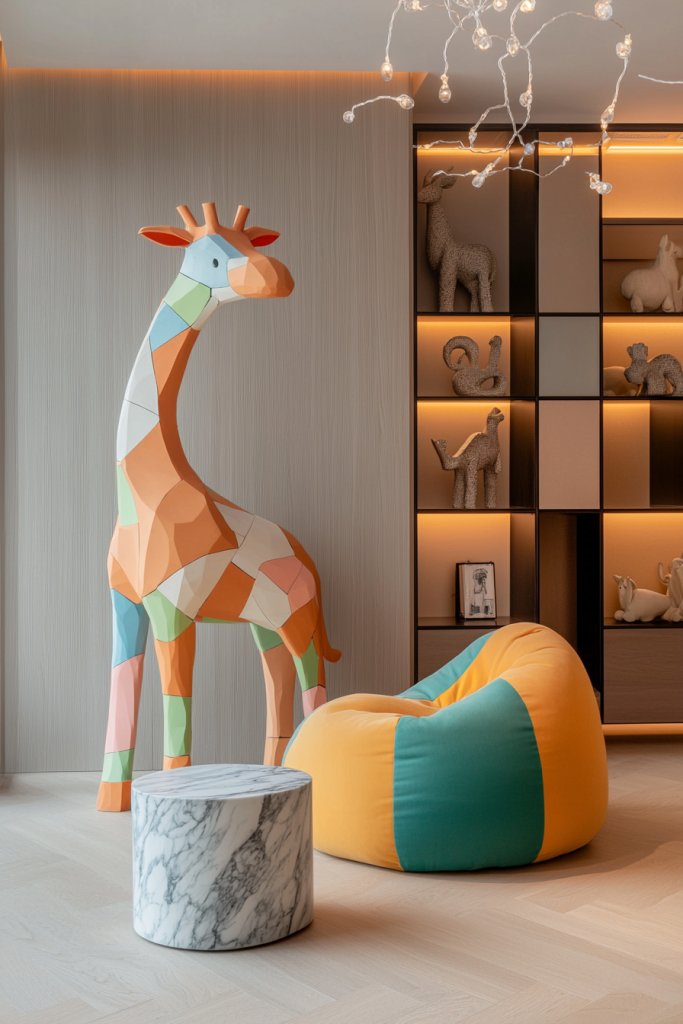 This contrast enhances the playful vibe while grounding the space. You could also create a small gallery of mini sculptures on a shelf; each piece can tell a story, reflecting your personality and interests.