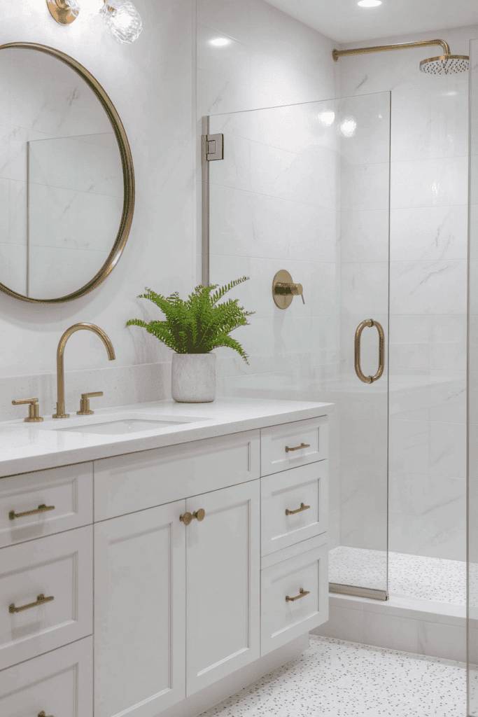 This bathroom perfectly balances minimalism and elegance. The bright white vanity paired with smooth gold fixtures gives the space a contemporary look, while the addition of a potted fern adds a touch of natural vibrancy. The frameless glass shower door with gold accents seamlessly integrates into the overall design, making the room feel open and airy. Subtle marble-patterned tiles enhance the luxurious vibe without overwhelming the simplicity.