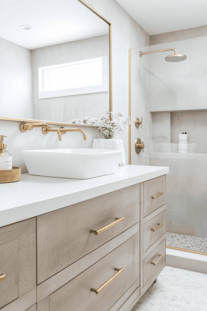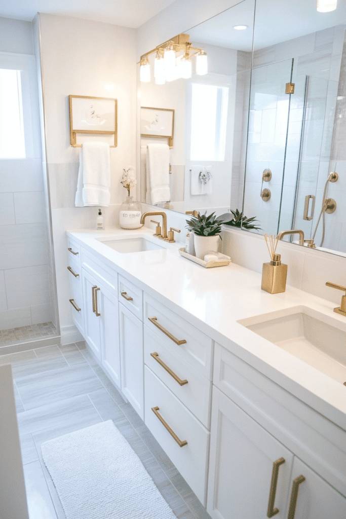 This bathroom blends practicality with elegance, featuring gold hardware that contrasts beautifully against the clean white vanity. Large mirrors amplify natural light, while a few well-placed decor pieces, such as potted greenery and minimalist gold accessories, add warmth and personality. This design is perfect for those seeking understated sophistication.