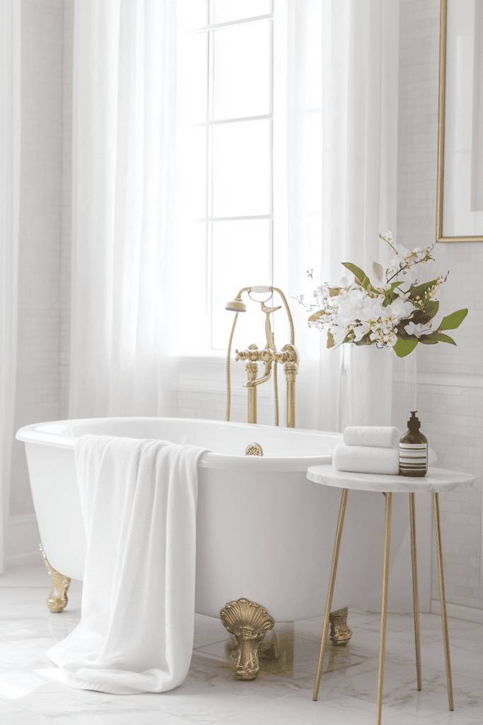 This elegant bathroom captures timeless beauty with its clawfoot tub adorned in intricate gold accents. Sheer white curtains allow natural light to pour in, highlighting the bright and airy atmosphere. A marble-topped side table and fresh flowers add a touch of grace, making this the perfect space to unwind in luxury.