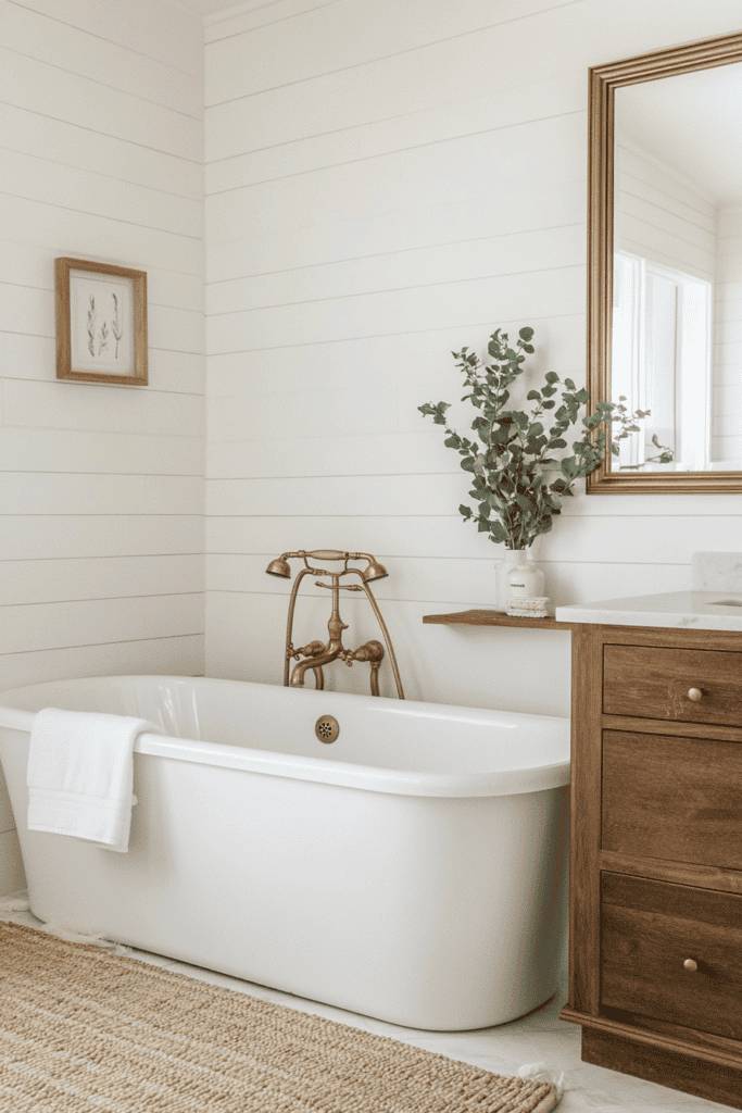 This farmhouse-inspired bathroom features a freestanding tub against a backdrop of white shiplap walls. The rustic gold fixtures blend seamlessly with the warm wood vanity, creating a cozy yet refined space. Subtle greenery and a woven rug add texture and warmth, bringing the design together with an inviting aesthetic.