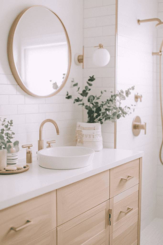 The combination of pale wood cabinetry and gold fixtures gives this bathroom a soft, minimalist look. The round gold-framed mirror and sleek white vessel sink add modern elements, while small potted plants create a lively, fresh vibe. This design is ideal for those seeking simplicity with a hint of luxury.