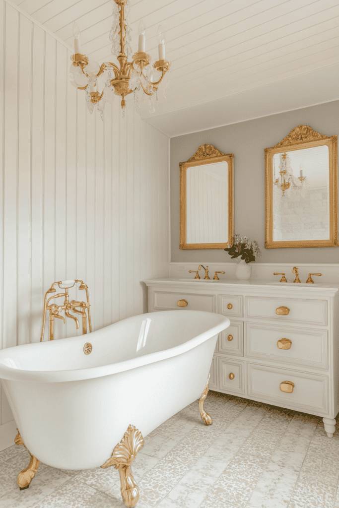 Steeped in vintage charm, this bathroom boasts a stunning clawfoot tub and dual gold-framed mirrors. A crystal chandelier adds drama, while the textured tile flooring complements the overall regal aesthetic. Gold hardware ties the space together, making this a luxurious throwback to classic Victorian style.