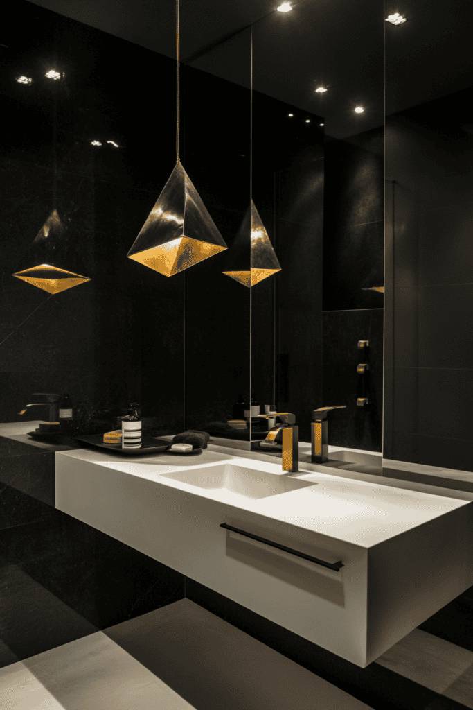 This striking bathroom combines sleek black walls with bold gold lighting and fixtures. The geometric pendant lights create a stunning focal point, while the floating white vanity provides contrast. This modern design is ideal for those who want to make a dramatic statement while maintaining elegance.