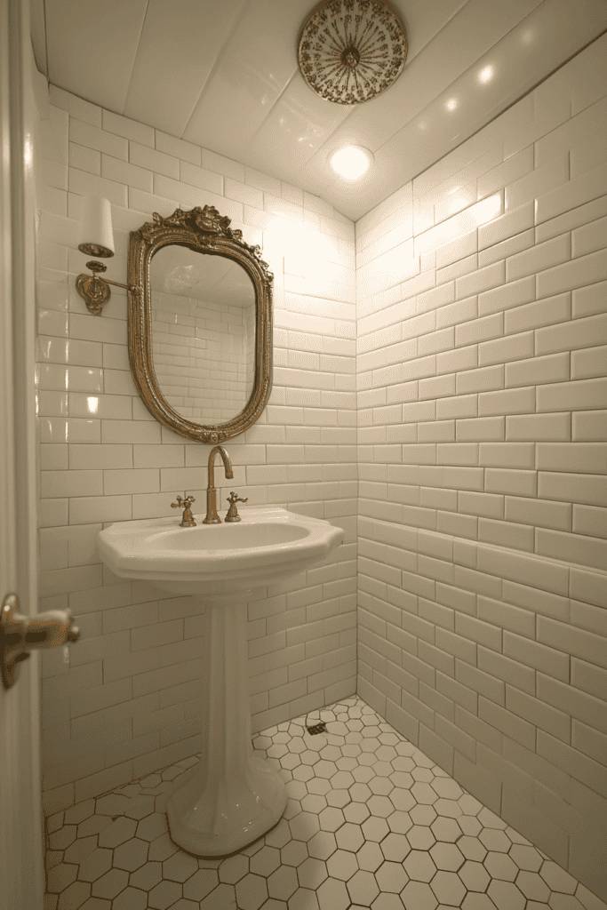 Vintage charm comes alive in this compact bathroom with its pedestal sink and ornate gold-framed mirror. The glossy white subway tiles on the walls and hexagonal floor tiles maintain a clean, timeless aesthetic. Gold fixtures, including a delicate sconce and faucet, add opulence, making this small space feel grand and glamorous.