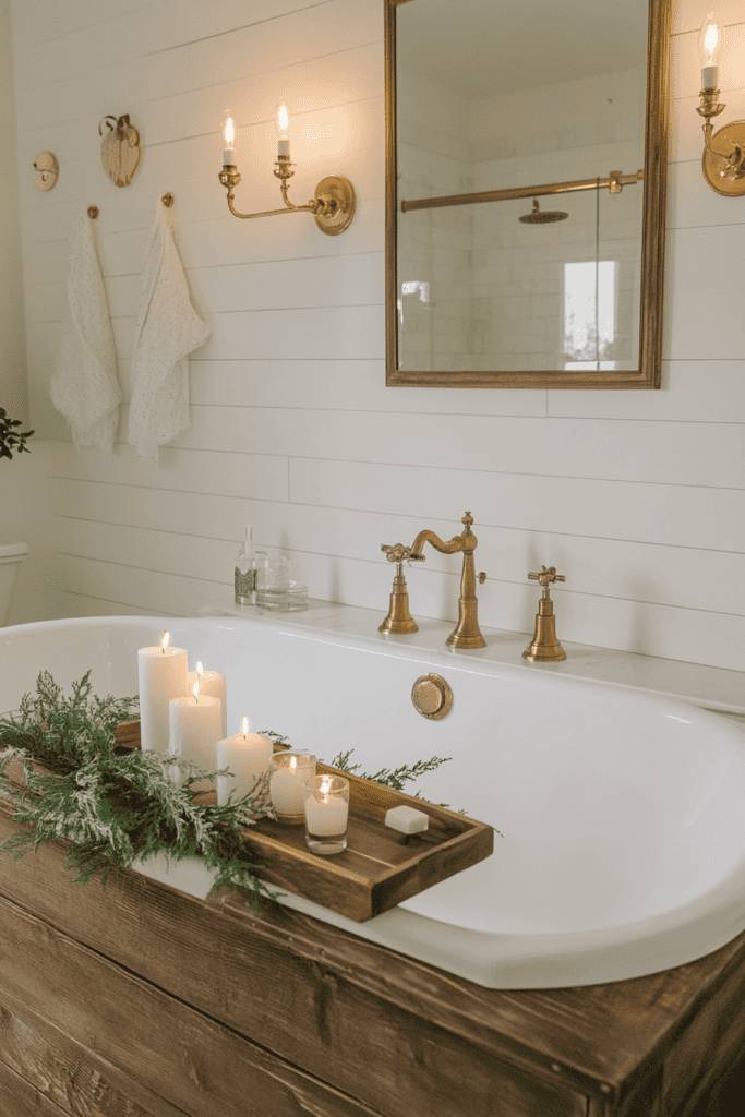 This charming bathroom combines rustic wood textures with elegant gold fixtures. The freestanding tub is adorned with vintage-style gold faucets, while soft candlelight adds warmth to the space. White shiplap walls provide a modern farmhouse aesthetic, and the gold-framed mirror brings a touch of sophistication. This setup is perfect for a tranquil, spa-like retreat at home.