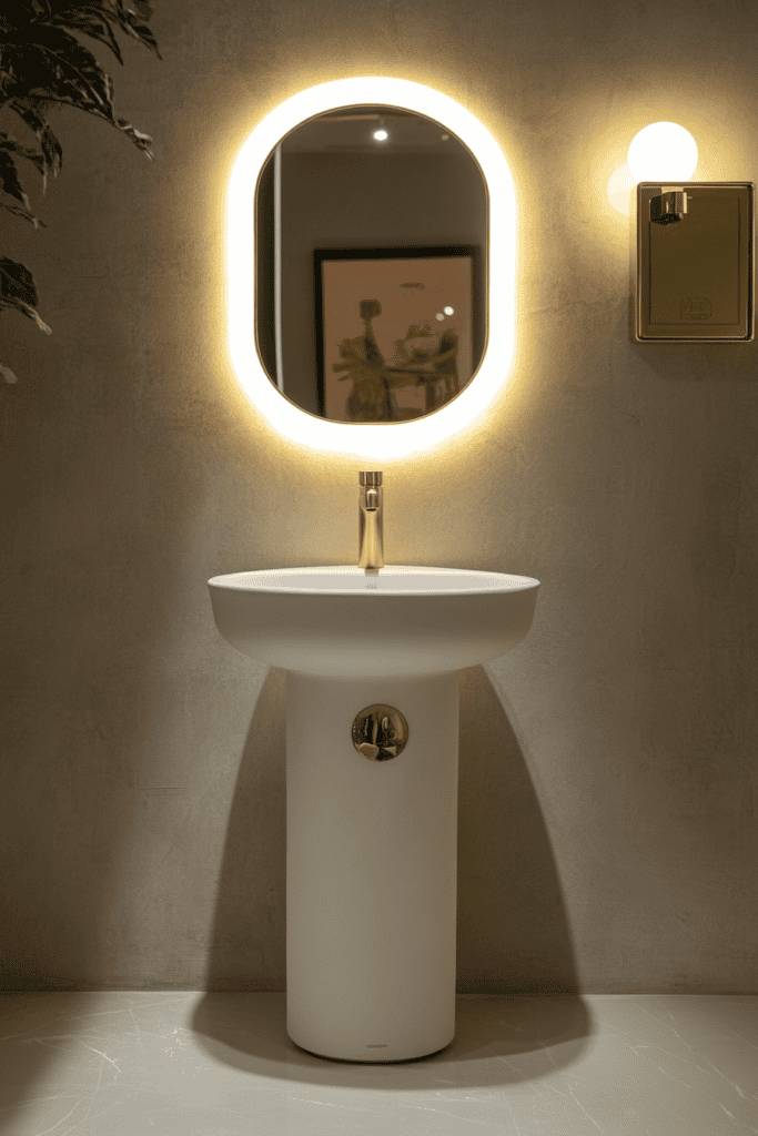 Simplicity and innovation shine in this design, with a pedestal sink complemented by a sleek gold faucet. The backlit oval mirror casts a soft, ambient glow, highlighting the bathroom’s clean lines. Gold accents in the lighting and fixtures enhance the minimalist approach, creating a sophisticated space that feels both futuristic and inviting.