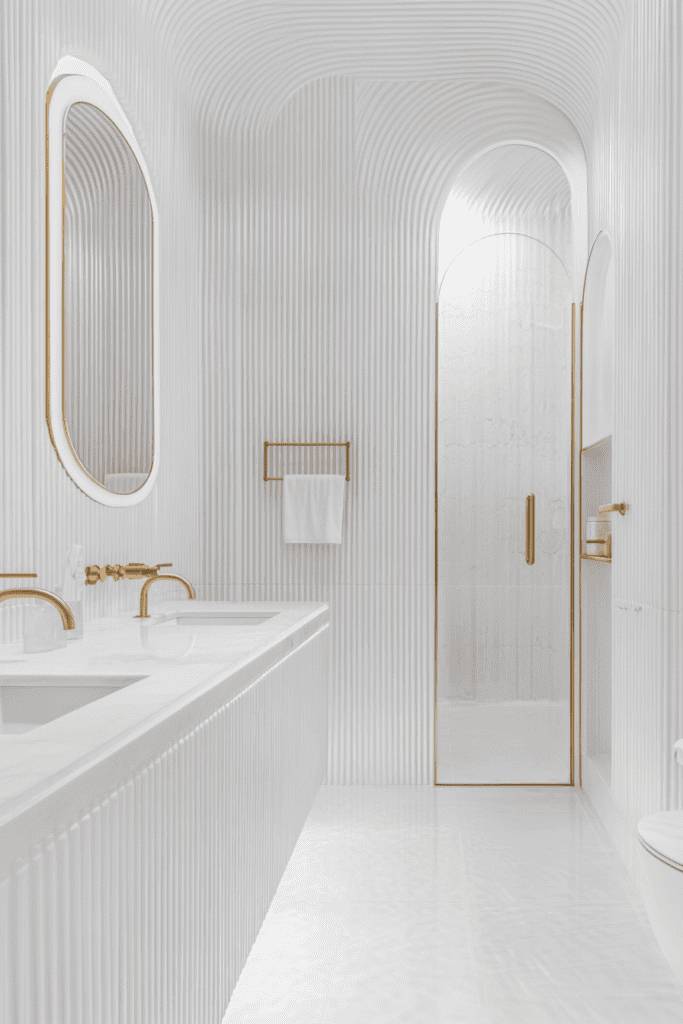 This luxurious bathroom showcases sculptural elegance, with textured white walls that add depth and movement. Gold faucets and a matching shower frame pop against the monochromatic background, creating a sense of modern opulence. The arched mirror and doorways reinforce the soft, flowing aesthetic, making this bathroom a visual masterpiece.