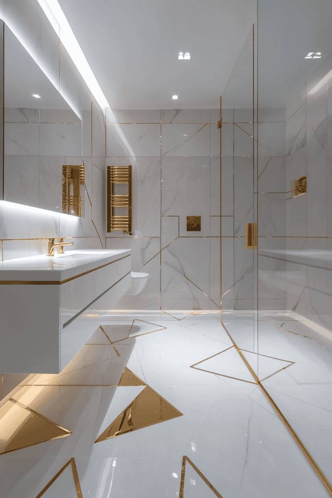 A true statement piece, this bathroom features bold geometric patterns in white and gold across the walls and floor. The seamless integration of gold accents into the tiles creates a striking design. Minimalist fixtures and built-in lighting enhance the overall modern aesthetic, making this bathroom both functional and visually stunning.