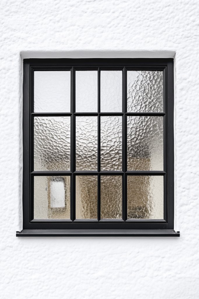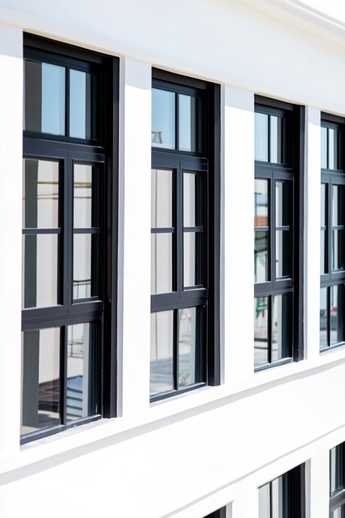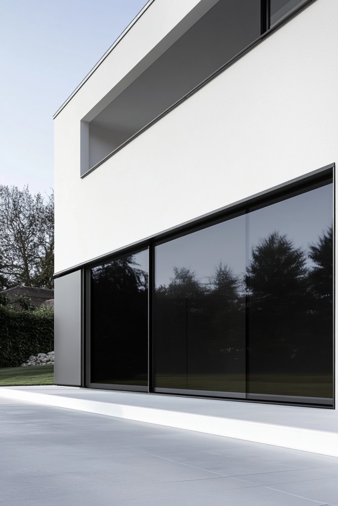 Their dark frames create a bold outline against the white exterior, emphasizing the large glass surfaces. Inside, the view becomes an ever-changing artwork—trees, sky, or cityscape—framed perfectly in black.