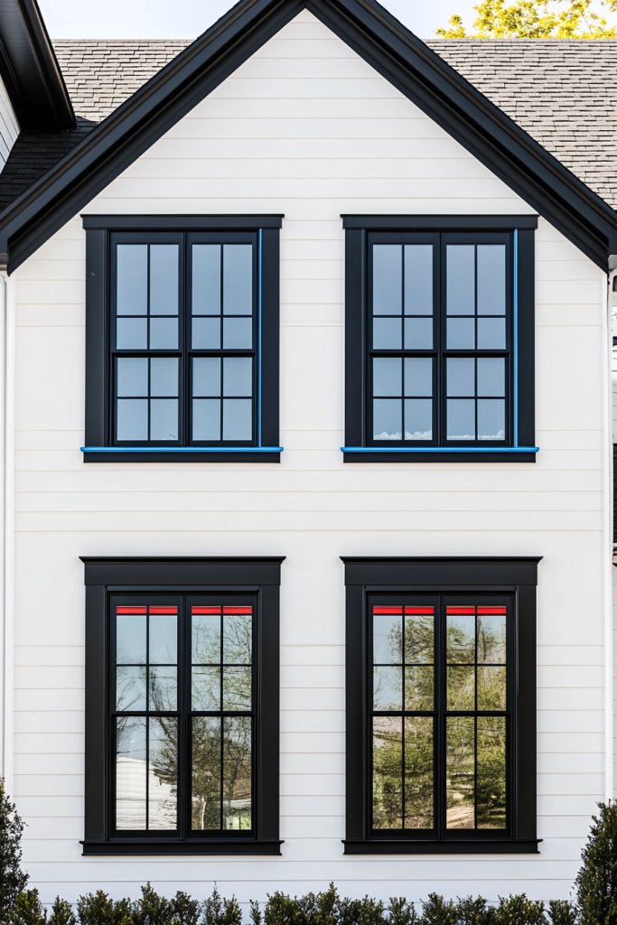 Want to add a playful or personalized touch to your home’s exterior? Black window frames with subtle colored accents create a striking contrast while injecting personality. Whether it’s a splash of red, yellow, or blue, these accents draw attention and make your windows uniquely yours.