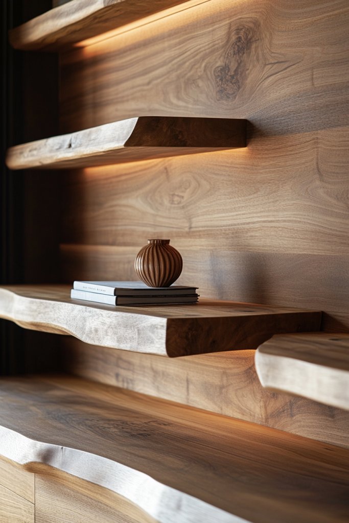 Floating shelves break up the surface, providing space for display and adding layers of visual complexity. The combination of raw, textured wood and sleek shelves balances rustic charm with modern minimalism.