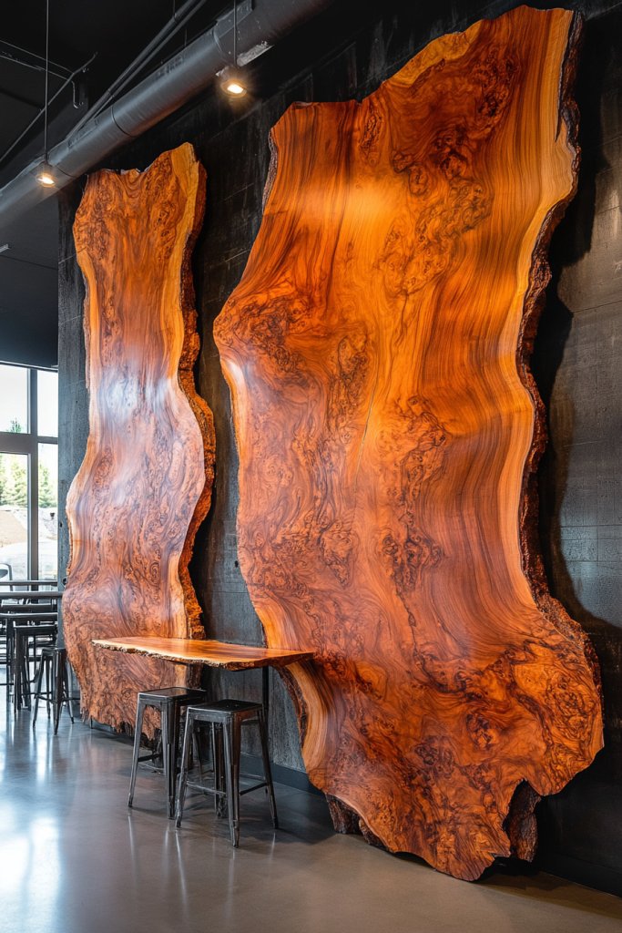 If your decor feels too polished or sterile, these slabs can introduce warmth and personality. Picture large, irregularly shaped wood panels with their natural edges preserved, showcasing knots, grains, and textures.