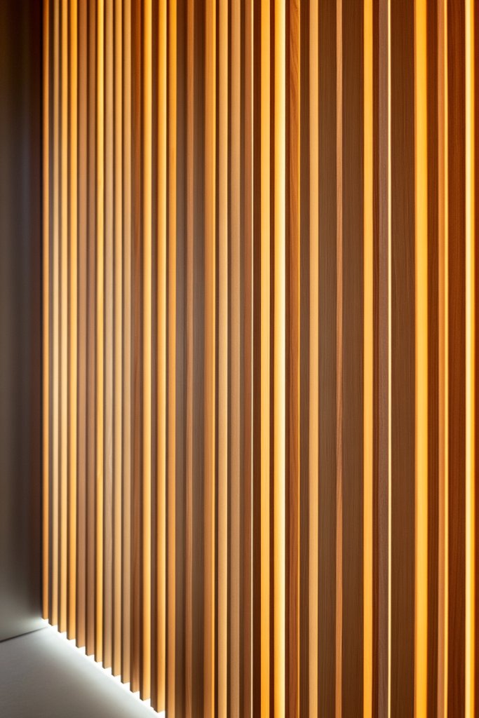 If your walls feel flat or uninspired, this design can turn them into a work of art. Visualize evenly spaced, slim wooden slats running from floor to ceiling, with concealed LED strips behind or within the gaps.