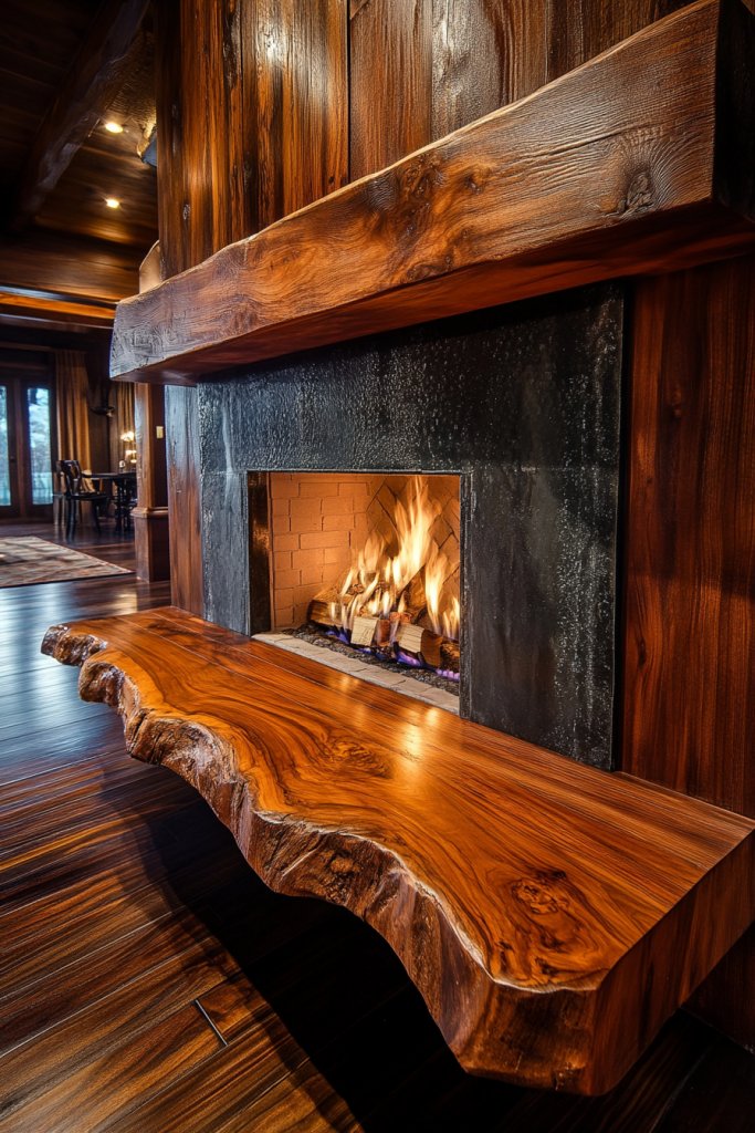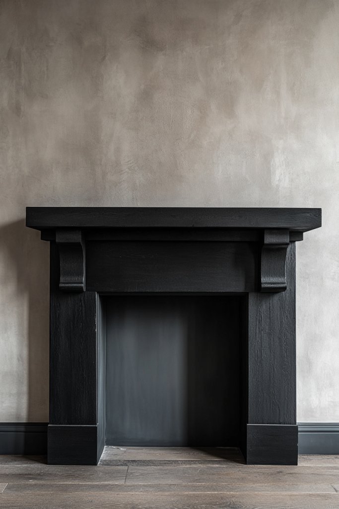 5. Blackened Timber Mantel for Dramatic Contrast
