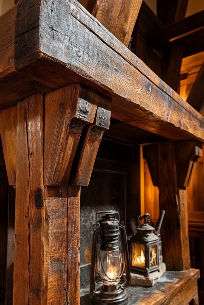 Visualize a pair of tapered timber beams with visible, handcrafted joints and mortises. The natural wood grain, combined with the exposed joinery, reveals the skill and effort behind their creation. Their warm, honey-toned finish enhances the vintage feel, making your fireplace area feel like a restored historical site. The beams frame the fireplace beautifully, adding depth and character.