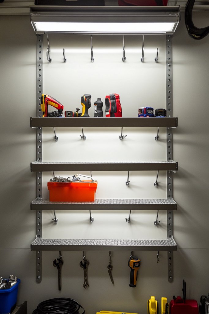 Too many small tools and accessories clutter your work surface? Multi-tiered hanging shelves with hooks are the perfect way to keep everything off your workbench and within arm’s reach. They add vertical storage, freeing up valuable space while keeping your essentials organized. It’s an easy fix for a more efficient workspace.
