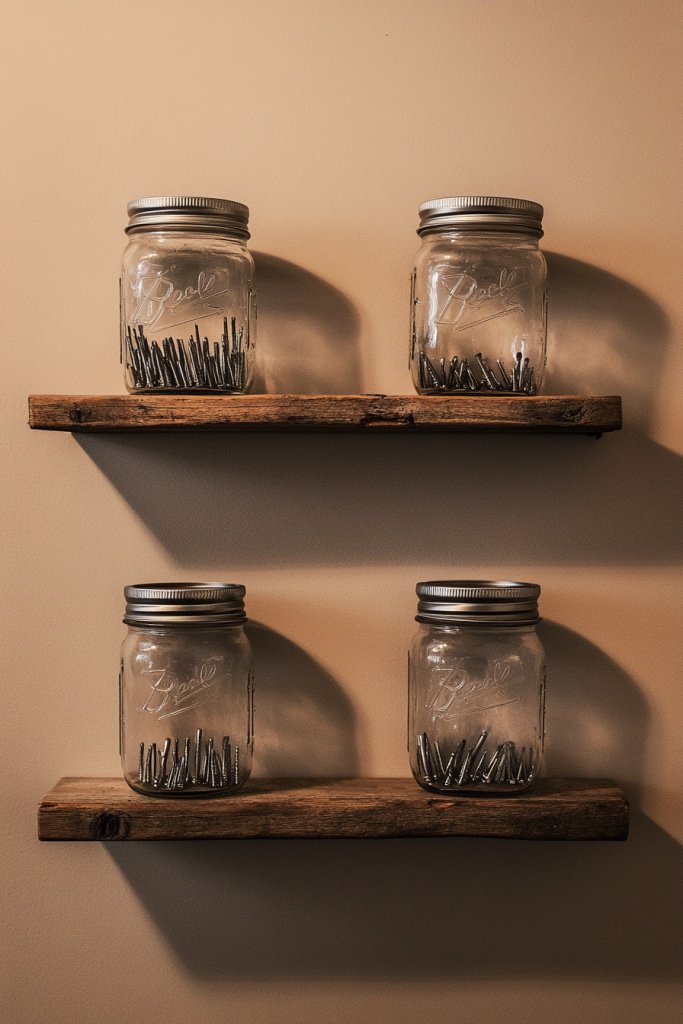 Struggling to keep tiny hardware organized? Mason jar shelves offer a charming and functional way to store nails, screws, and other small bits. They bring a vintage touch to your workspace while making everything easy to see and access. It’s a simple, cost-effective upgrade that keeps clutter at bay.