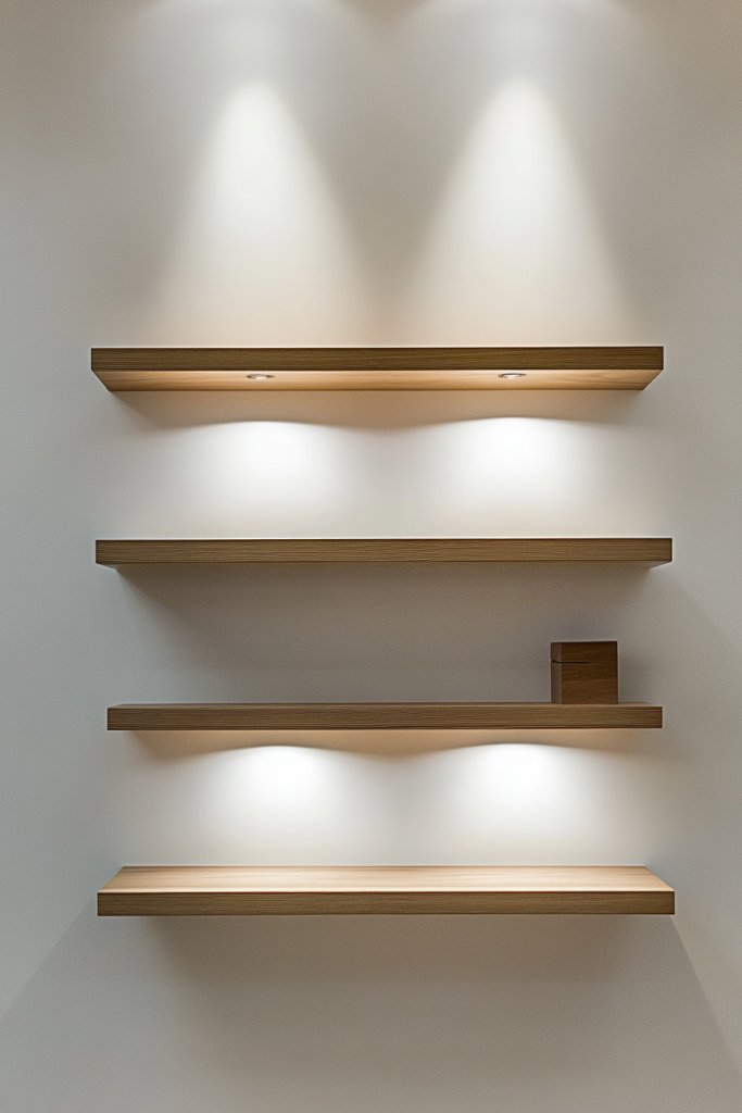 Choose from different materials—light pine for a Scandinavian look, or dark-stained oak for a rich, classic feel. Vary the length and thickness depending on your storage needs. For seasonal variation, swap out items or change the shelf color. To add a touch of elegance, pair open shelves with decorative lighting or subtle wall textures.
