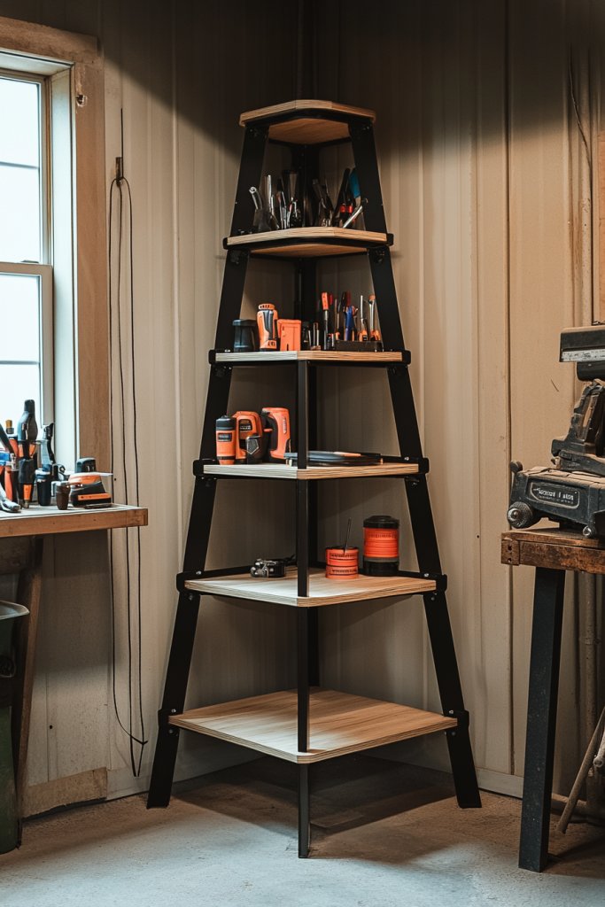 Visualize a multi-tiered unit fitting snugly into a corner, with open shelves displaying frequently used tools or supplies. Below, cabinets with doors hide less attractive or less frequently accessed items. The design combines functionality with clean lines, balancing openness and privacy. The finish could be sleek laminate, painted wood, or rustic reclaimed planks, depending on your style.