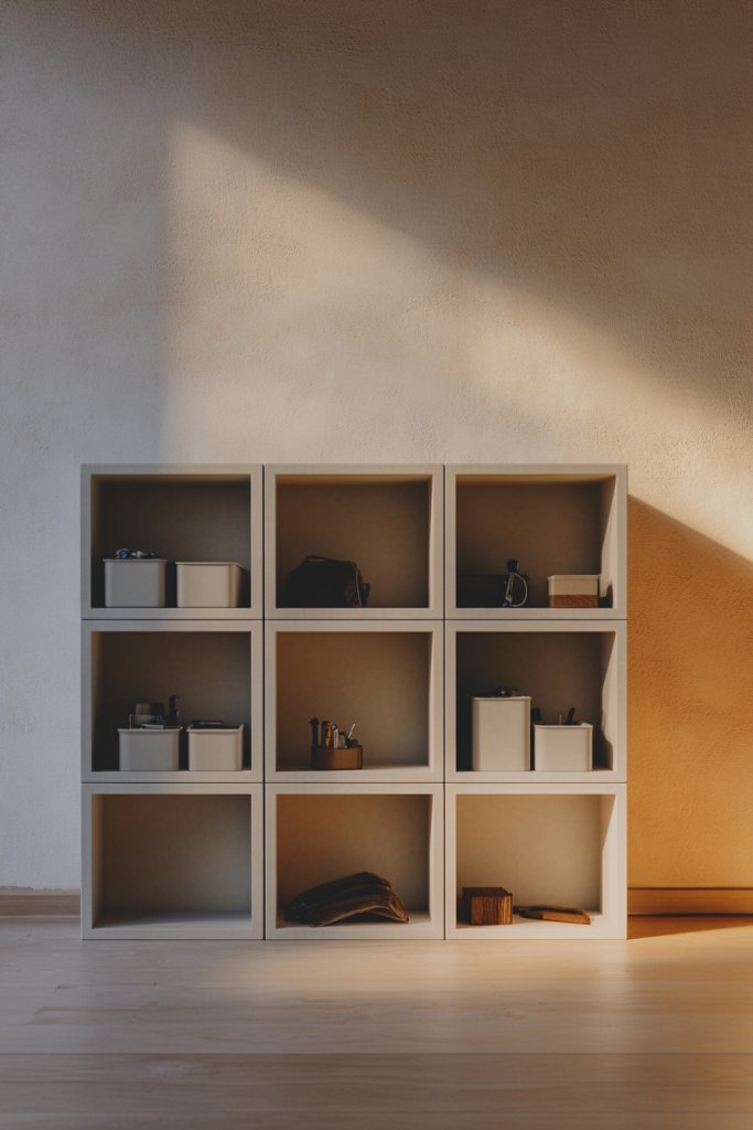 Picture cube-shaped units made of wood or metal, stacked in different configurations against the wall or on the floor. Open cubes can hold bins, tools, or decorative items, while closed ones hide clutter. The modular design allows for creative layouts—stack vertically, side-by-side, or even in a grid pattern. The clean geometric lines add a modern, playful vibe.